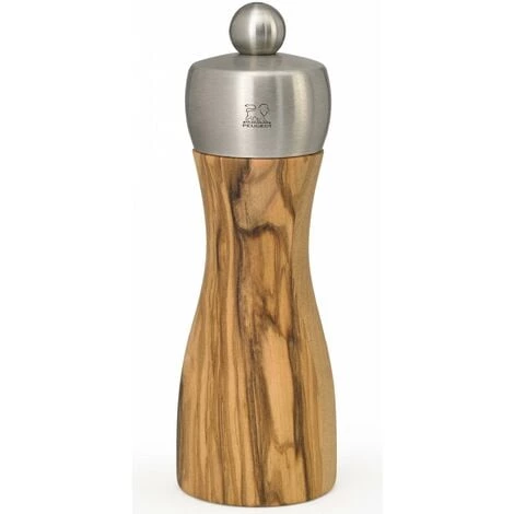Moulin à poivre Fidji Olivier Peugeot 33804. Du bois d’olivier pour une pièce unique !Avec sa ligne impeccable, son travail sur la matière, il est ultra féminin et sensuel.L?olivier est un bois noble exceptionnel, symbole de force et de longévité.Ses inimitables veines aux lignes naturelles extraordinaires lui confèrent toute sa préciosité, faisant de chaque moulin un objet unique.Le bois d?olivier utilisé pour la confection de votre moulin est issu de forêts européennes gérées dans le respect des ressources naturelles.Son toucher velouté achève d’en faire un véritable must.Bouton de réglage de la mouture : plus le bouton est serré, plus la mouture et fine.Le mécanisme à poivre est muni d’une double rangée de dents hélicoïdales qui capture les grains, les entraîne vers le bas, puis les bloque afin de les moudre parfaitement.Il bénéficie d’un traitement breveté qui protège l’acier de la corrosion tout en gardant son tranchant et sa résistance à l’usure.Le mécanisme à sel est conçu pour moudre du gros sel sec.Réalisé en acier inoxydable, il n’est pas sensible à la corrosion saline.Un point sur le bouton indique l’épice : noir pour le poivre et blanc pour le sel.Idéal pour un usage sur la table mais aussi en cuisine.