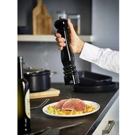 Moulin à sel électrique Paris Laqué Noir U’Select Peugeot 36256. Référence incontestable des grands chefs et des tables d’excellence, le moulin emblématique de Peugeot, avec sa forme galbée et généreuse, se décline en électrique pour sublimer la diversité et l’intensité des arômes des épices ! Premier moulin électrique en bois massif, PARIS, le modèle phare de la marque, offre la gestuelle du moulin manuel et la praticité de l’électrique, démontrant toute l’ingéniosité qui fait la renommée de Peugeot. Une seule main est nécessaire pour mettre en marche ce moulin à l’apparence d’un moulin manuel. Il est équipé du système U’Select de réglage de la mouture : système de réglage breveté qui permet d’ajuster avec précision la taille de la mouture (6 moutures différentes). Le mécanisme à poivre est muni d’une double rangée de dents hélicoïdales qui capture les grains, les entraîne vers le bas, puis les bloque afin de les moudre parfaitement en les tranchant plutôt qu’en les écrasant afin de révéler subtilement les parfums et les saveurs du poivre. Il bénéficie d’un traitement breveté qui protège l’acier de la corrosion tout en gardant son tranchant et sa résistance à l’usure. Le mécanisme à sel, en acier inoxydable non sensible à la corrosion saline, est conçu pour moudre du gros sel sec en le réduisant en fine poudre. En bois de hêtre massif avec vernis noir laqué triple couche. Hauteur 34 cm. Idéal pour un usage en cuisine mais aussi sur la table : vous ne pourrez plus vous passer de ce moulin élégant et pratique ! Fonctionne avec des batteries rechargeables Lithium-ion. Chargement de la batterie par câble (câble fourni). Temps de charge : environ 2 h. Une charge de batterie suffit à moudre jusqu’à 4 remplissage de moulin.