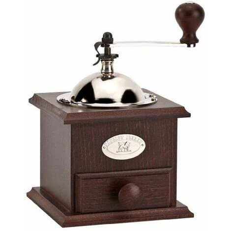 Moulin à café de forme carrée muni d’un petit tiroir permettant de récupérer le café fraîchement moulu. Le réglage de la mouture s’effectue par la molette située sous la manivelle.